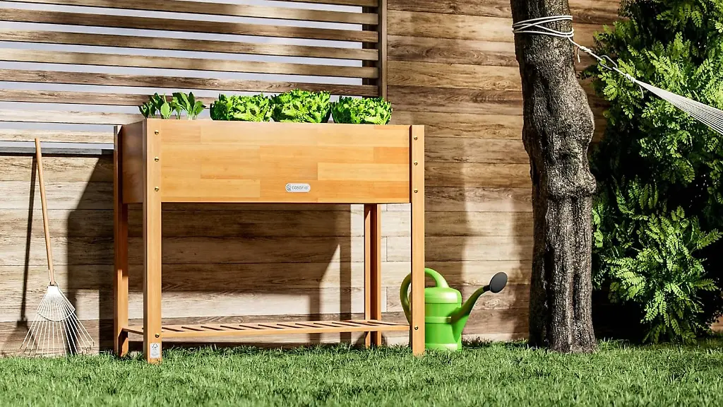 Dieses Hochbeet von Casaria ist der Inbegriff von Langlebigkeit. Gefertigt aus FSC-zertifizierter Akazie trotzt das Casaria-Hochbeet laut Hersteller Wind und Wetter. Das geölte Finish schützt vor Verrottung und sieht richtig edel aus. Mit einer Arbeitshöhe von 84 Zentimetern gärtnert man völlig entspannt. Cleveres Extra: Die integrierte Ablage unter dem Pflanzkasten hält Schaufel, Dünger und Gießkanne immer griffbereit. Jede Stufe trägt bis zu 40 Kilogramm – da darf es auch mal die schwere Pflanzenerde sein. Aktuell ist das Hochbeet bei Amazon für knapp 75 Euro erhältlich, günstiger kommt man inklusive Versand nicht daran.