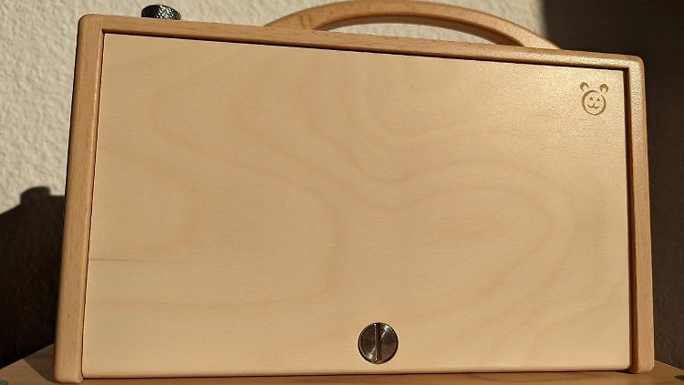 Schon beim Auspacken unterscheidet sich der Hörbert auf den Blick von vielen anderen Musikspielern für Kinder: Das Gerät besteht zum Großteil aus Holz, das mit einem speichelfesten Lack überzogen ist.