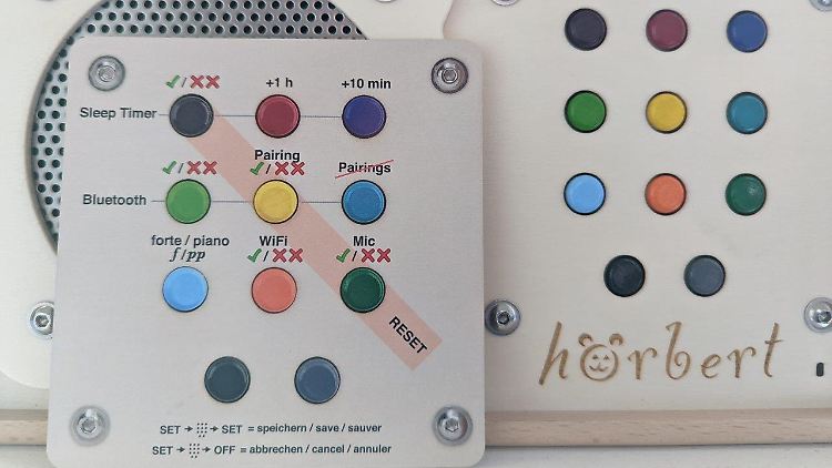 So weit, so einfach. Wer aber WLAN, Bluetooth, den Sleep-Timer oder die Lautstärkebegrenzung aktivieren will, muss wieder die Schraube auf der Rückseite öffnen. Über den Batterie-Halterungen im Inneren des Hörbert befindet sich ein kleiner Set-Knopf. Wird er gedrückt, spielen die Tasten auf der Vorderseite keine Musik ab, sondern aktivieren die verschiedenen Funktionen. Das ist mitunter doch etwas umständlich, wie das folgende Beispiel zeigt. Als wir den Hörbert via Bluetooth mit unserem Smartphone koppeln möchten, um ihn als Lautsprecher zu nutzen, müssen wir folgende Schritte befolgen: