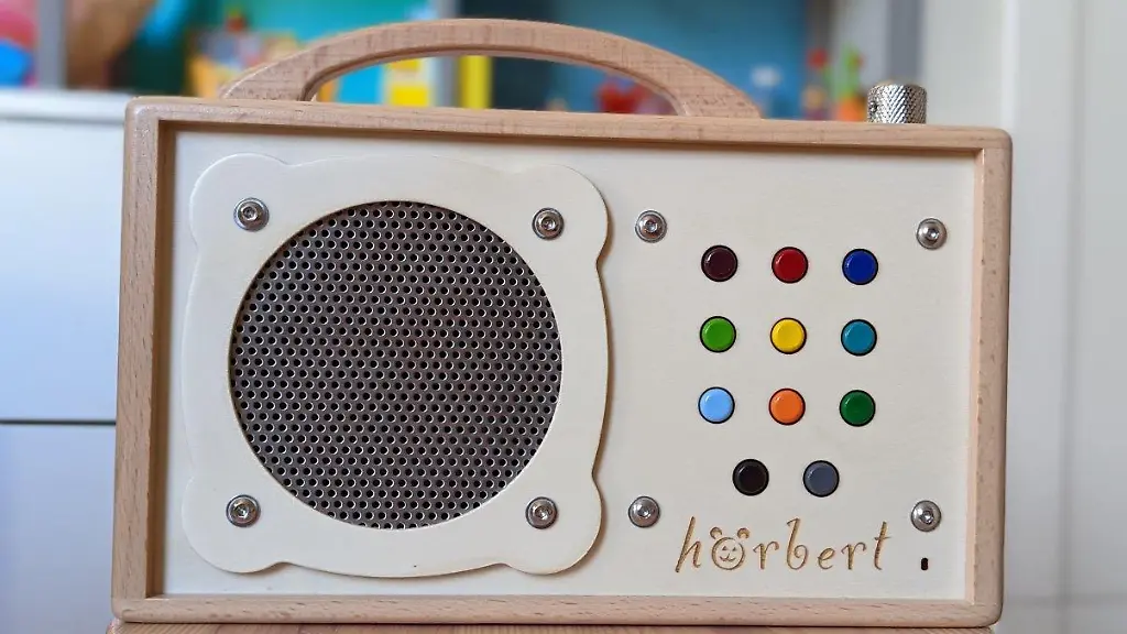Als wir den Hörbert aus dem Paket heben, staunen wir. Das Gerät ist ganz schön schwer. Ganze 1,1 Kilo zeigt unsere Küchenwaage an – da sollte lieber kein Kinderfuß im Weg sein, wenn Hörbert einmal fallen gelassen wird. Gefertigt wird die Box laut Hersteller in Deutschland mit Holz aus nachhaltiger Forstwirtschaft, der Plastikanteil liegt unter fünf Prozent. Das macht schon mal einen guten Eindruck. Oben auf dem Gerät befindet sich neben dem Tragegriff ein Knopf, der gleichzeitig als An- und Ausschalter sowie als Lautstärkeregler dient. Auf der Vorderseite sind der Lautsprecher aus Edelstahl sowie die bunten Holzknöpfe zur Bedienung angebracht.
