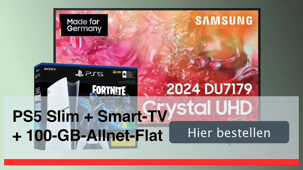 Die PlayStation Slim Digital-Edition kostet im hier angebotenen "Fortnite Cobalt Star"-Bundle aktuell mindestens 439 Euro. Der Samsung-Fernseher ist inklusive Versand ab 579 Euro zu haben. Das ergibt einen Gesamtwert von 1.018 Euro. Während der 36-monatigen Vertragslaufzeit fallen hingegen nur Hardware-Kosten in Höhe von 684 Euro an. Hinzu kommen 39,90 Euro Versand für den Fernseher und ein Euro Anzahlung. Konsole und Smart-TV kosten hier also effektiv nur 724,90 Euro.