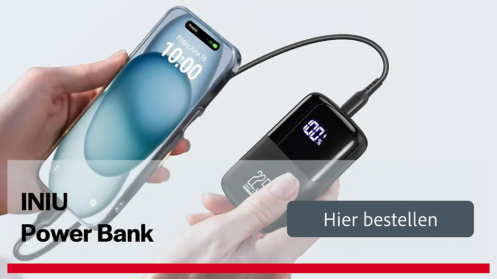 Die Iniu Powerbank speichert dabei laut Herstellerangaben rund 1,8 Ladungen eines iPhone 15. AirPods sollen sogar ganze elfmal aufgeladen werden können. Dazu sind die angegebenen Maße der Powerbank erstaunlich kompakt. Mit nur 10,4 x 6,6 x 2,3 Zentimeter passt der tragbare Energiespeicher in viele Hosentaschen und ist unterwegs jederzeit zum Laden des Smartphones einsetzbar. Kleiner Nachteil: Ein kabelloses Laden ist nicht möglich. Dafür lassen sich aber über zwei USB-A und einen USB-C-Anschluss gleich drei Geräte gleichzeitig laden.