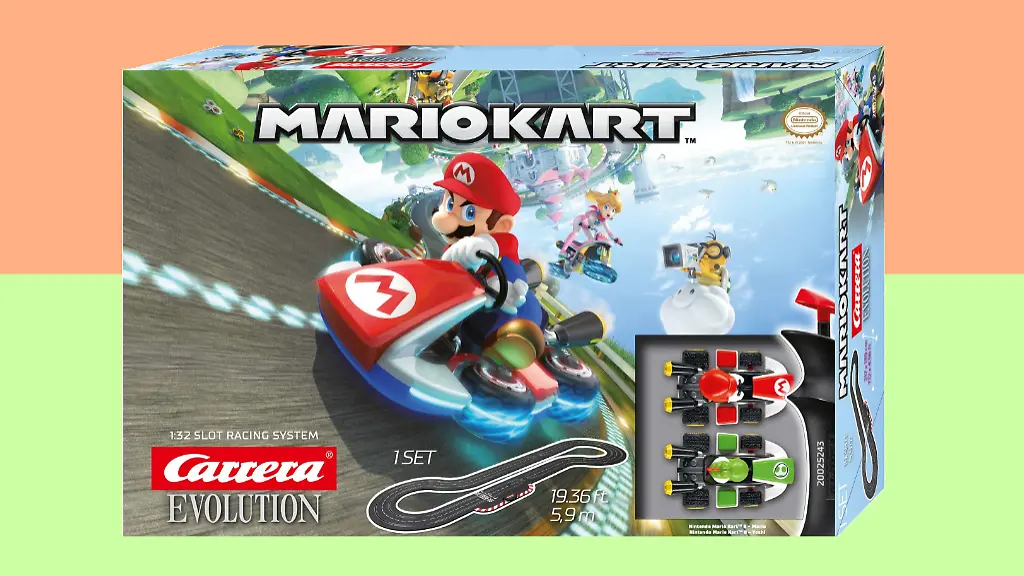 Es handelt sich bei der angebotenen Rennbahn um ein Modell der Evolution-Reihe. Die zeichnet sich durch einen besonders üppigen Maßstab von 1:24 aus und bietet damit deutlich mehr Platz als etwa die kleineren Carrera-Go-Modelle, die es ebenfalls im Mario-Kart-Design gibt. Wer das passende Zimmer dazu am Start hat und sich für wilde Rennen abseits der Spielekonsole begeistert, wirft einen Blick auf das Angebot. Das Preis-Leistungsverhältnis ist top.