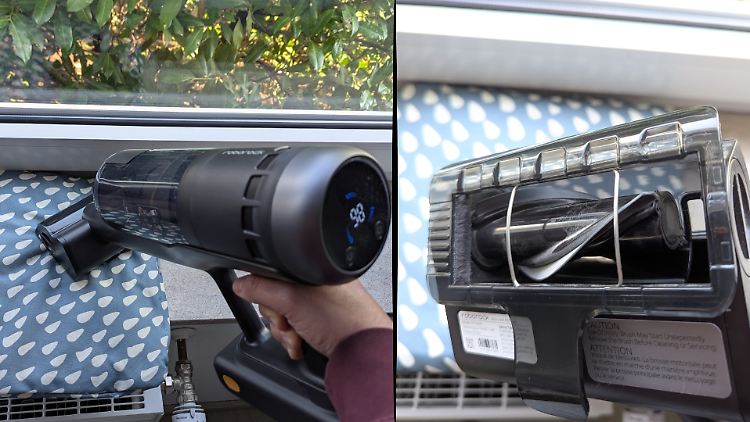 Anschließend nutzen wir den Maxi-Modus, um ganz kompakt ohne Teleskoprohr Polster und Kissen mit der kleinen Bürste katzenhaarfrei zu bekommen. Zwar müssen wir ein paarmal über die Oberfläche gleiten, aber am Ende sind die Haare weg. Wie bei vielen Modellen anderer Hersteller kann man allerdings bei Vollgas der Power-Anzeige beim Schrumpfen zusehen. Zudem ist der Geräuschpegel des Saugers jetzt deutlich lauter und schriller. Der Akku selbst ist auswechselbar.