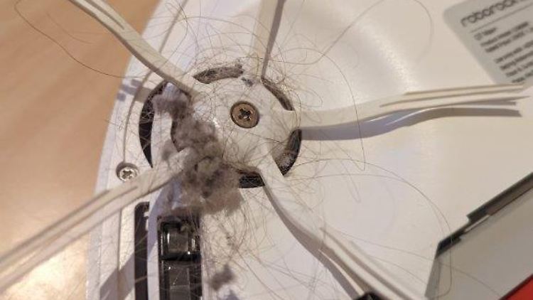 Bei der anschließenden Untersuchung des Roboters stören uns zwei Dinge: Die rotierende Plastikbürste an der Seite hat sich fleißig mit langen Haaren umwickelt. Da sie nur mit einem Schraubendreher ausgebaut werden kann, müssen wir zur Schere greifen, um die Haare zu entfernen. Die rote Walze kann dagegen per Hand entnommen werden. Vor dem Einzugsschacht hinter der Walze hat sich eine beachtliche Staub- und Fusselansammlung gebildet, die wir per Hand entfernen. Beim Getöse, das beim Absaugen an der Reinigungsstation veranstaltet wird, hätten wir erwartet, dass so große Rückstände ebenfalls beseitigt werden.