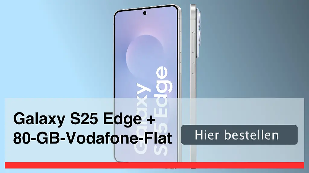 Der Mobilfunkanbieter Klarmobil etwa verlangt für das brandneue Samsung-Smartphone im Verbund mit einer 80-Gigabyte-Allnet-Flat im 5G-Netz von Vodafone einmalig nur 129,99 Euro. Die Mobilfunkoption schlägt mit monatlich 39,99 Euro zu Buche. Dafür gibt es 80 Gigabyte Datenvolumen mit einer Datenrate von bis zu 150 Megabit pro Sekunde sowie eine Telefon- und SMS-Flatrate. Plus: Dank Vorbesteller-Aktion von Samsung erhält man das Galaxy S25 Edge mit 512 Gigabyte internem Speicher zum Preis der 256-Gigabyte-Version. Das Smartphone hat also einen tatsächlichen Gegenwert von 1.369 Euro.