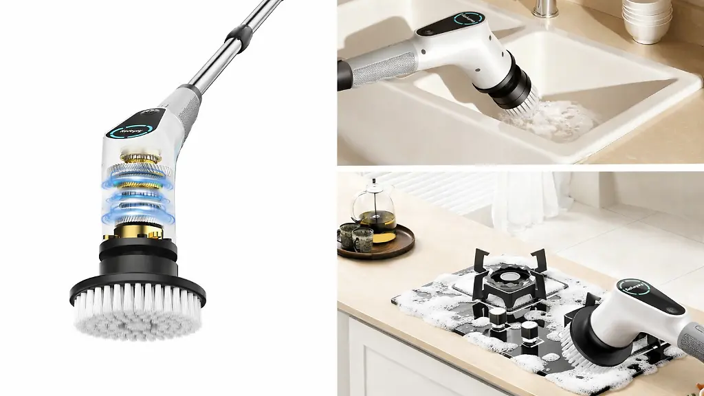 Die elektrische Reinigungsbürste von Kedoyoy lässt sich im Haushalt flexibel einsetzen. (Foto: Amazon/ntv.de (KI-generiert))