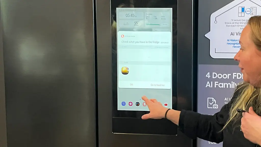 Mit dem doppeltürigen geräumigen Kühlschrank sollen wir künftig besser im Blick behalten können, welche Lebensmittel noch verfügbar sind. Aber auch von unterwegs - zum Beispiel aus dem Supermarkt - soll man sich schnell ein Bild über den Ist-Zustand in Sachen gekühlter Lebensmittel machen können: Eine im Kühlschrank verbaute Kamera kann mithilfe des AI "Food Managers" per App gesteuert werden. Erhoffter Nebeneffekt: Es sollen weniger Lebensmittel im Mülleimer landen, sagt Katharina Visic, Head of Produktmanagement bei Samsung Electronics.