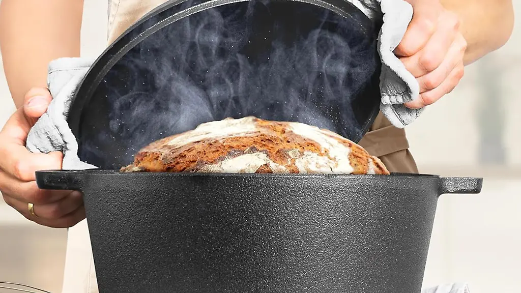 Gusseisentöpfe punkten vor allem bei freigeschobenen Broten, also solchen ohne Kastenform. Durch ihr Gewicht und die Fähigkeit, Hitze gleichmäßig zu speichern, erzeugen sie eine backofenähnliche Umgebung im Kleinen. Der Teig profitiert vom entstehenden Dampf – der schafft eine glänzende Kruste und verhindert das Austrocknen. Am bekanntesten – aber auch am teuersten – sind die Modelle der Marke Le Creuset. Der kirschrote Signature Gusseisen-Bräter mit Deckel beispielsweise kann auf Amazon mit 4,7 von fünf Sternen bei über 9.000 Bewertungen glänzen.