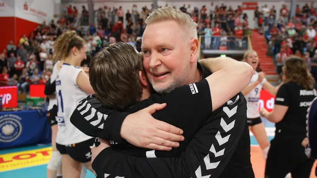 "Auf diese Leistung dürfen alle Spielerinnen, mein Trainer-Team, der Verein und die vielen Leute im Umfeld stolz sein", sagte Aleksandersen nach dem Spiel laut "Stuttgarter Zeitung/Nachrichten". Der Coach hatte den Krimi hinter der Bande beobachtet, war aber in den Pausen zwischen den Sätzen stets beim Team gewesen. Nach dem letzten Punkt fiel ihm Sportdirektorin Kim Oszvald-Renkema glücklich in die Arme. Emotional reagierten auch die Spielerinnen. "Dieser Titel bedeutet uns enorm viel", sagte Mittelblockerin Marie Schölzel bei Sport1: "Wenn der Headcoach da ist, ist es einfach etwas anderes. Die Mannschaft ist komplett mit ihm. Ich bin stolz auf die Mädels, das so durchzuziehen."