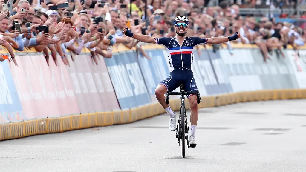Alaphilippe holte sich stattdessen mit einer seiner beherzten Attacken erneut im Alleingang das Regenbogentrikot. Schon im Vorjahr hatte er als Solist in Imola triumphiert. 32 Sekunden hinter Alaphilippe sicherten sich in Flandern, wo am Sonntag hunderttausende Menschen an die Strecke pilgerten, der Niederländer Dylan van Baarle und der Däne Michael Valgren die weiteren Medaillen. Wout van Aert, Hoffnung von geschätzt über einer Million fanatischer belgischer Radsport-Fans am Streckenrand, wurde Elfter.