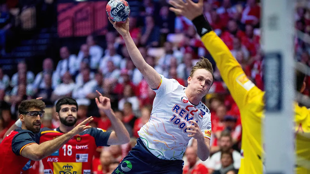 Norway-s-Tobias-Groendahl-in-action-with-Spain-s-goalkeeper-Ignacio-Biosca-during-the-European-Championship-handball-match-between-Spain-and-Norway-in-Herning-Denmark-Thursday-Jan-22-2026