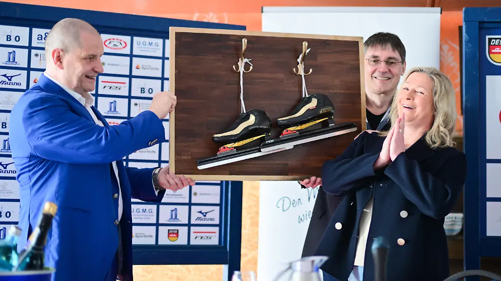 Claudia Pechstein ist, das wird bei diesem Termin im tiefsten Südosten Berlin überdeutlich, eine besondere Sportlerin. Schon allein deshalb, weil die Eisschnellläuferin hier erst mit 53 Jahren verkündet, ihre große Karriere tatsächlich und endgültig und vor allem aus freien Stücken beenden zu wollen. Sie werde "die Schlittschuhe an den Nagel hängen", sagt Pechstein, und dann halten Lebensgefährte Matthias Große und Manager Ralf Grengel ihr wirklich ein Brett hin, um die Schlittschuhe daran aufzuhängen. Das Sprichwort sieht eigentlich nur einen Nagel vor, "aber wir sind etwas besonders, wir nehmen zwei", erklärt Pechstein und lächelt in die vielen Kameras, die in diesem Moment auf sie gerichtet sind.