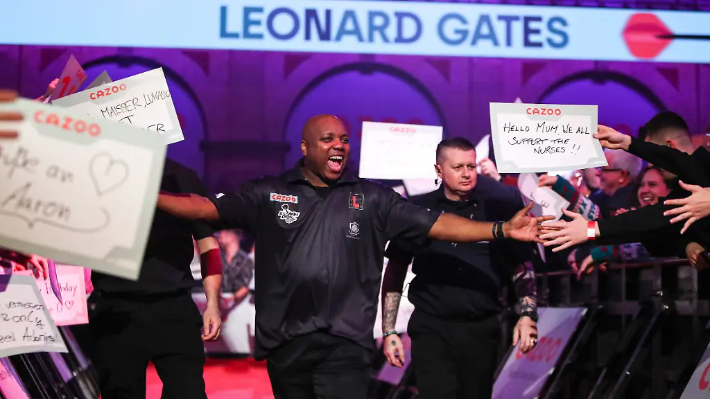 Die Zuschauer würdigen die positive und ansteckende Art des US-Amerikaners. Sofort ist klar, dass Gates an diesem Abend ein Heimspiel hat. Sein Gegner, der junge Niederländer Geert Nentjes, ist fast schon zu bemitleiden. Zwar schnappt sich der 24-Jährige zunächst etwas glücklich den ersten Satz, doch in der Folge wirkt Nentjes zunehmend verunsichert. Leonard Gates dagegen kämpft sich mit der Unterstützung der 3.000 Fans zurück in die Partie, gleicht zum 1:1 aus. Von da an ist der "Ally Pally" elektrisiert. Immer wieder gehen die "USA"-Rufe durch die Halle. In der Endphase der Partie ist Gates der bessere Mann. Nentjes resigniert und spielt derart indisponiert, dass sich Gates selbst sieben verpasste Matchdarts leisten kann und dennoch 3:1 gewinnt.