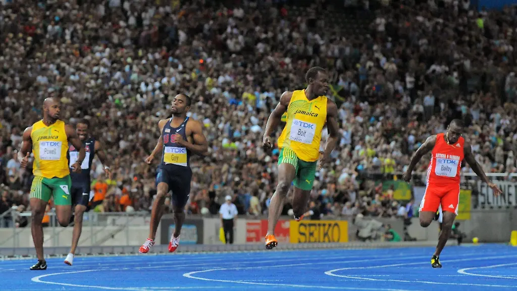 Einer fliegt, die anderen rennen. Während ein 100-Meter-Rennen durchaus mal mit einem Zielfotoentscheid endet, ist die Übermacht Usain Bolts am 16. August 2009 im Berliner Olympiastadion bereits nach etwa 40 Metern auf der blauen Bahn deutlich. Selbst Tyson Gay, der in dem WM-Finale den US-Rekord verbessert, folgt dem Jamaikaner mit Abstand. Der Blick des in Gelb und Grün Gekleideten richtet sich noch vor der Ziellinie auf die Anzeigetafel. 9,58 Sekunden leuchten gelb auf schwarz auf.
