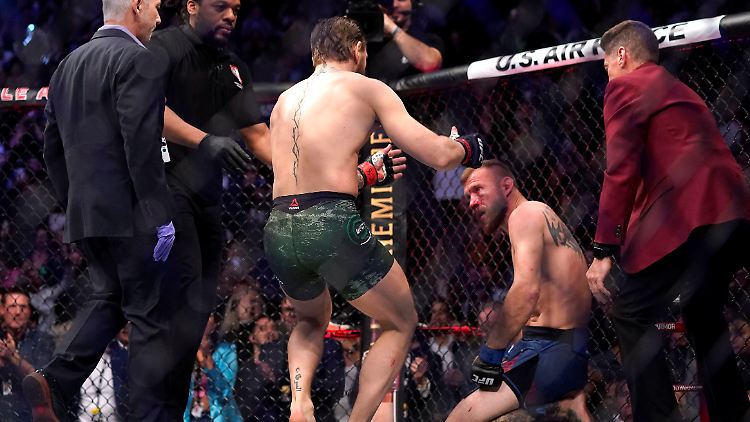 Der leicht benommene Cerrone ging auf Distanz und kassierte einen Highkick ans Kinn, der ihn endgültig ins Taumeln brachte. McGregor setzte nach, bis Cerrone nicht mehr aus der Deckung kam. Auf ein technisches K. o. entschied der Ringrichter. Der Cowboy war am Boden, McGregor obenauf und die Arena ins Vegas tobte.