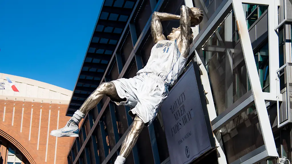 Die Statue an dem zur Arena führenden Nowitzki Way zeigt den Deutschen bei seinem typischen "One Leg Fadeaway". Dabei sprang Nowitzki zurück, hielt mit einem Bein das Gleichgewicht und warf aus dieser Bewegung heraus.