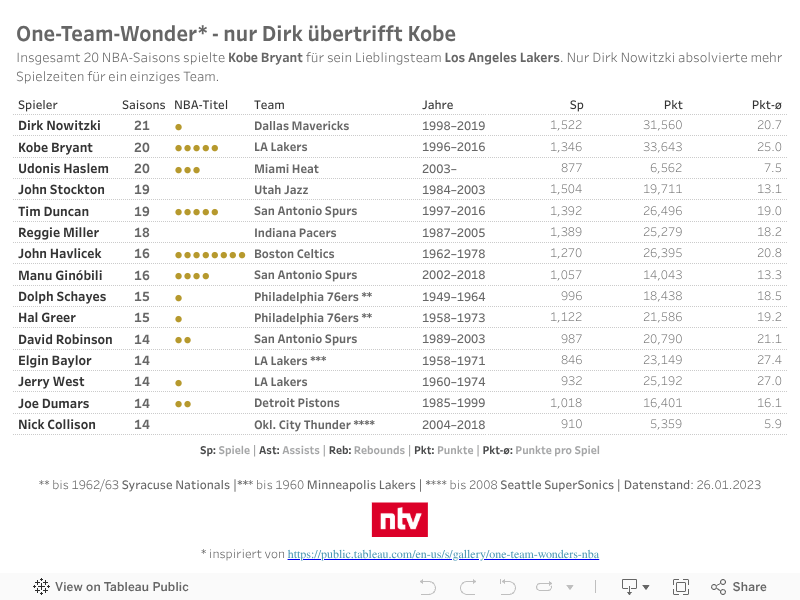 "Wie viele Kinder können sagen, dass sie für ihr Lieblingsteam spielen und ihre ganze Karriere dort verbringen durften", schwärmte Bryant 2016 nach seinem letzten Spiel für die Lakers und befand: "Du kannst diese Story nicht besser schreiben." Im ewigen NBA-Ranking der "One-Team-Wonder" wird Bryant tatsächlich nur von einer anderen Basketball-Ikone übertroffen: Dirk Nowitzki, der sogar 21 Spielzeiten für die Dallas Mavericks auflief - und damit eine mehr als Bryant für seine Lakers.