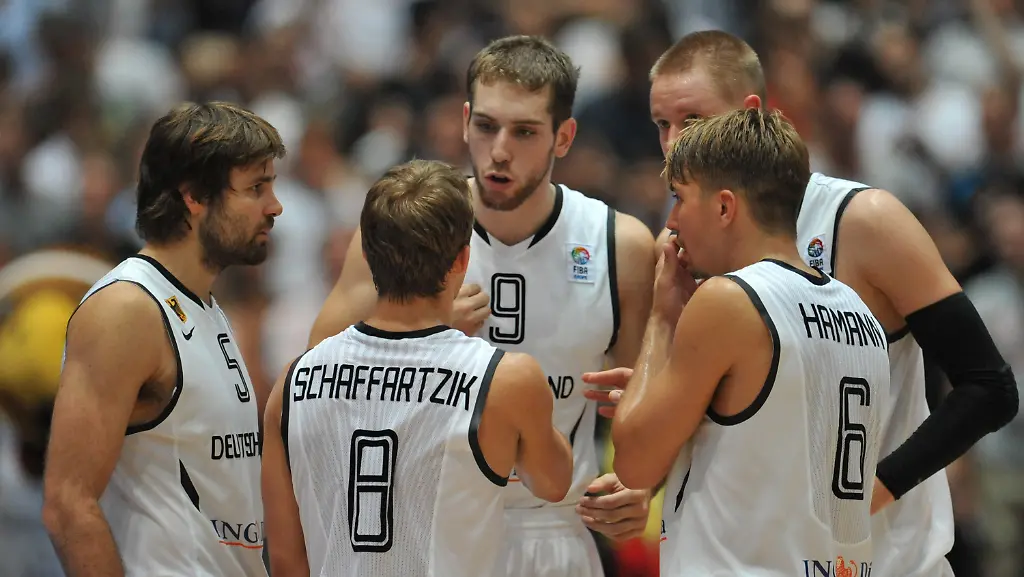 Starting Five/Starter: Jene fünf Spieler, die beim Tip-Off auf dem Parkett stehen. Bis zum letzten EM-Test in Berlin schien die Starting Five mit Steffen Hamann (1), Johannes Herber (2), Robin Benzing (3), Nowitzki (4) und Kaman (5) festzustehen. Dann tauschte Bundestrainer Dirk Bauermann Herber gegen den treffsicheren Heiko Schaffartzik und kündigte an, diese offensivstärkere Variante auch bei der EM beibehalten zu wollen.