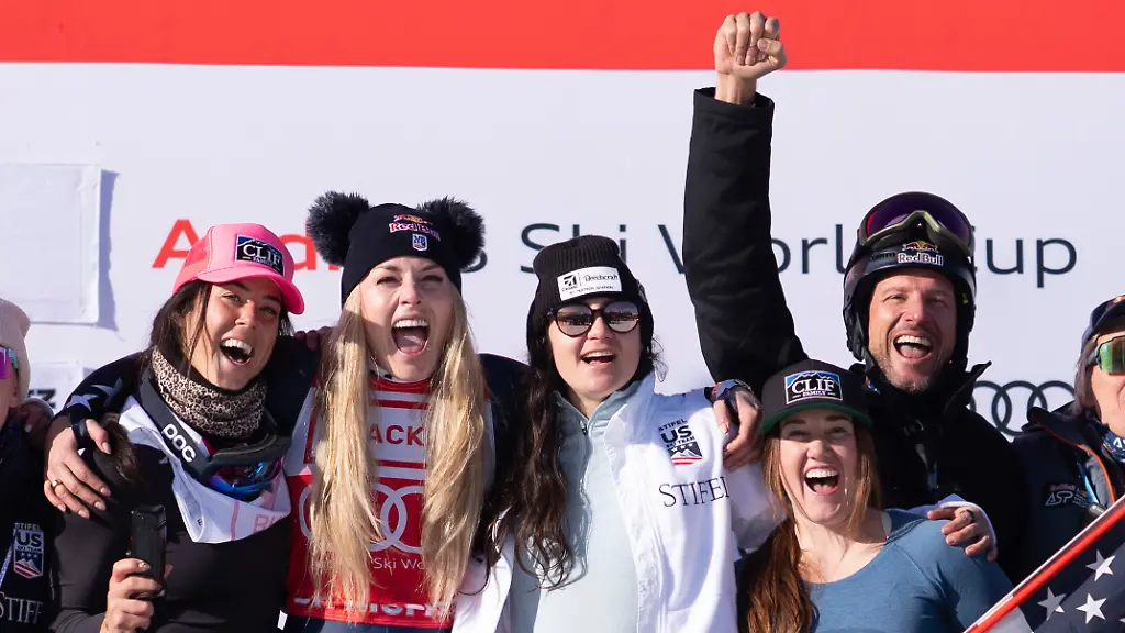 Ein Bild aus glücklichen Tagen. Lindsey Vonn (2.v.l.) mit ihrer Crew nach dem Sieg in St. Moritz im Dezember 2025. (Foto: picture alliance/KEYSTONE)