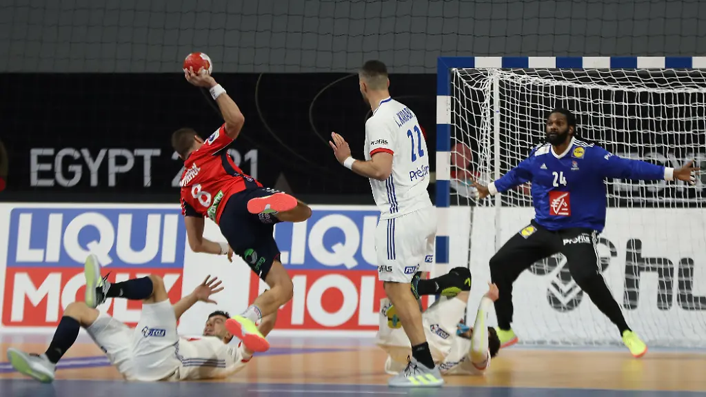 Rekordchampion Frankreich ist mit einem Achtungserfolg in die Weltmeisterschaft in Ägypten gestartet. Im ersten Spitzenspiel des Turniers setzten sich die Franzosen in Gizeh mit 28:24 (13:13) gegen Vize-Weltmeister Norwegen durch. Erfolgreichster Werfer Frankreichs war der ehemalige Bundesliga-Profi Kentin Mahé mit neun Treffern. Den Norwegern verhalfen dagegen auch die zehn Tore des Kieler Superstars Sander Sagosen nicht zum Sieg.