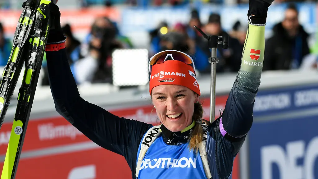 Auf der Zielgeraden blieb Denise Herrmann-Wick sogar noch genügend Zeit, um den Jubel der Fans aufzusaugen. Strahlend reckte die beste deutsche Biathletin den rechten Arm in den Himmel von Antholz und bejubelte ihr Mini-Jubiläum. Keine drei Wochen vor der Heim-WM setzte die Olympiasiegerin im Verfolgungsrennen mit dem zehnten Weltcupsieg ihrer Karriere ein dickes Ausrufezeichen.