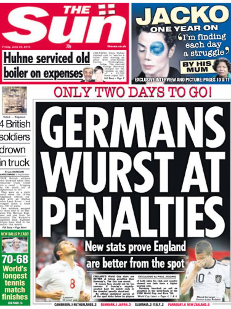 Dass die DFB-Auswahl bei Weltmeisterschaften eine Elfmeter-Erfolgsquote von 97 Prozent hat, England aber nur von 50 Prozent hat, passte leider nichts ins Blatt.