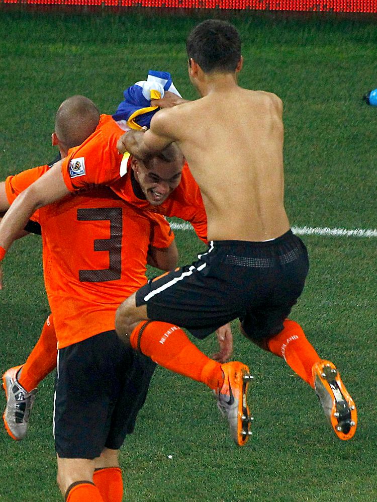 Dribbelkünstler Robinho hatte die Südamerikaner vor 40.186 Zuschauern im Nelson-Mandela-Bay-Stadion bereits in der 10. Minute mit seinem zweiten Turniertor in Führung gebracht, doch nach dem Seitenwechsel kippte die Partie. Felipe Melo, der Wesley Sneijders hohe Hereingabe ins eigene Netz verlängerte (53.), und Sneijder (68.) selbst per Kopfball sorgten für den zweiten Viertelfinal-K.o. der Brasilianer nacheinander. Die zweite WM-Niederlage gegen Holland nach 1974 vor Augen verlor Felipe Melo die Nerven und sah nach einem bösen Tritt gegen Arjen Robben in der 73. Minute vollkommen zu Recht die Rote Karte.