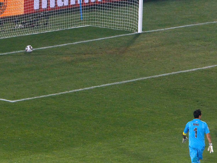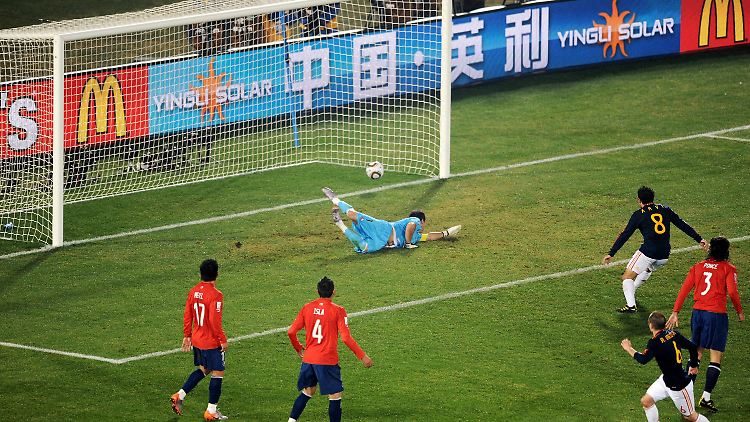 Abseits der Szene jubelte Iniesta über den 100. Treffer dieser WM, den Villa überlegt vorbereitet hatte. Kurz zuvor hatte Gerard Pique in letzter Sekunde den Ausgleich durch Chiles linken Flügelflitzer Jean Beausejour verhindert. Mit dem beruhigenden Vorsprung im Rücken kontrollierte Spanien gegen zehn Mann das Geschehen, konnte sein gefürchtetes Kurzpassspiel aber nur selten aufziehen.
