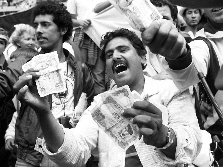 Vermuteten eine Absprache der Spieler und winkten mit Geld auf der Tribüne: Wütende algerische Fans in Gijon.