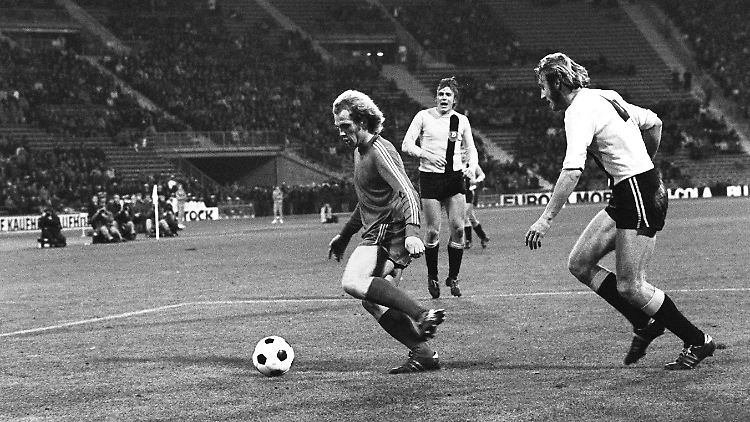 Beim Achtelfinal-Hinspiel im Fußball-Europapokal der Landesmeister am 24. Oktober 1973 wird Bayerns Mittelfeldspieler Uli Hoeneß (links) im Münchner Olympiastadion vom Dresdner Verteidiger Geyer angegriffen.