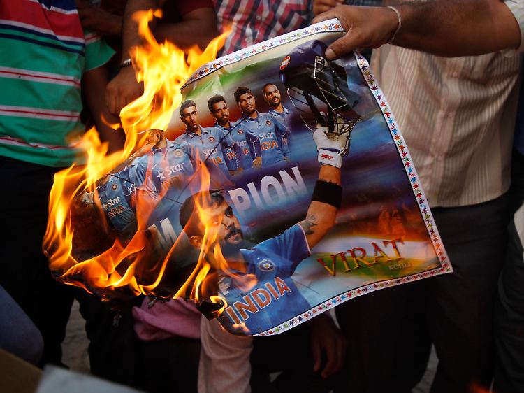 Nach dem Ausscheiden des Titelverteidigers Indien verbrennen wütende Fans eine Zeitung mit einem Poster der entthronten Champions..