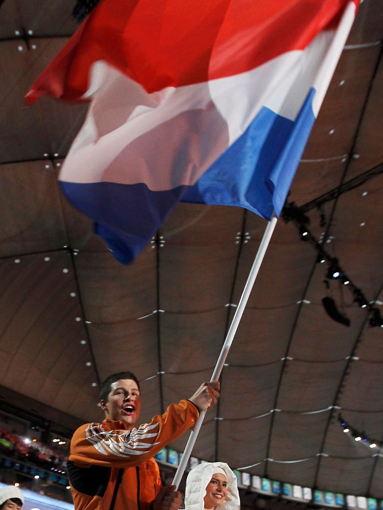 Sven Kramer durfte bei der Abschlussfeier die niederländische Fahne tragen, obwohl er nur eine statt drei Goldmedaillen gewonnen hat.