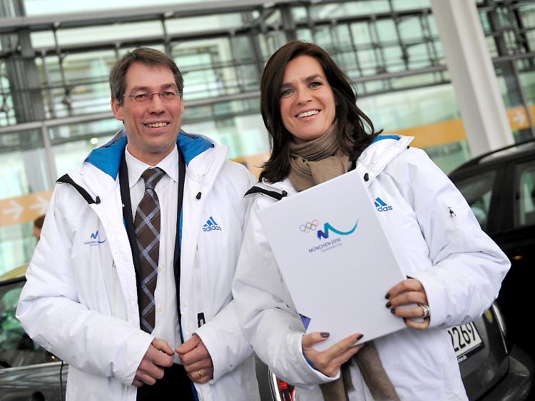 Katarina Witt und Bewerbungschef Bernhard Schwank mit dem Münchner Bid Book.