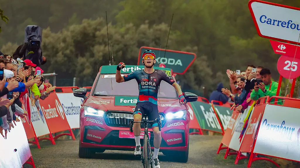 Lennard Kämna riss die Arme nach oben und klopfte sich auf die Brust, nachdem er die matschige Piste am Collado de la Cruz hinaufgestürmt war. Der frühere Junioren-Weltmeister hat sein Triple bei den Grand Tours perfekt gemacht und die neunte Etappe der 78. Vuelta im Alleingang gewonnen. Nach seinen Tagessiegen bei der Tour de France in Villard-de-Lans (2020) und dem Giro d'Italia auf dem Ätna (2022) durfte er nun auch bei der dritten der drei großen Radrundfahrten jubeln. Kämna siegte 184,5 Kilometer von Cartagena nach Collado de la Cruz de Caravaca mit rund 30 Sekunden Vorsprung vor dem Italiener Matteo Sobrero.