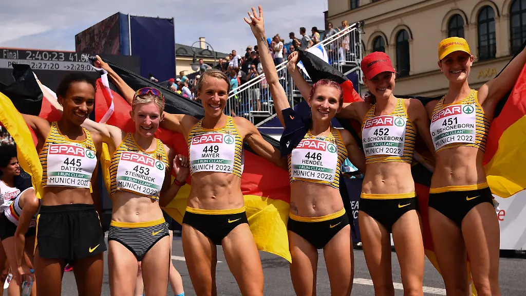 Die deutschen Marathon-Läuferinnen haben bei der EM in München die Goldmedaille im Teamwettbewerb gewonnen. Bei den ersten Leichtathletik-Entscheidungen im Rahmen der European Championships setzten sich Miriam Dattke (Regensburg/Rang 4), Domenika Mayer (Regensburg/Rang 6) und Deborah Schöneborn (Berlin/Rang 10) durch. Den EM-Titel im Einzelrennen sicherte sich die Polin Aleksandra Lisowska.