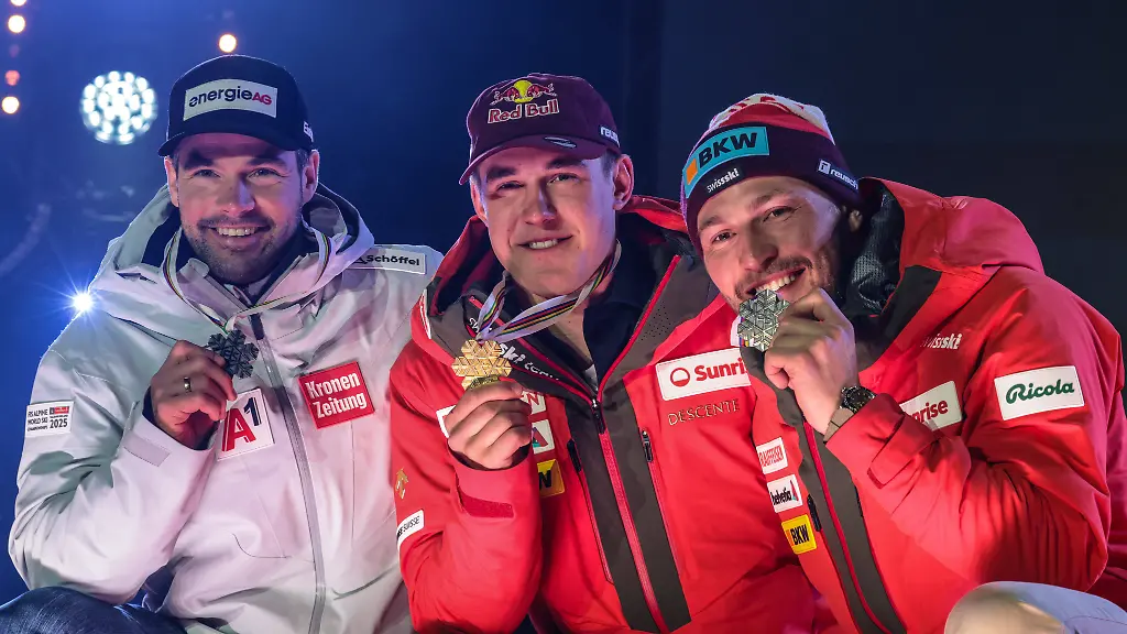 Aber die Österreicher sind ja gute Gastgeber. Alle Medaillengewinner der WM holen sie auf die Bühne oben in der weitläufigen ersten Etage, vier Schweizer Erfolge wurden da bereits mehr als höflich bejubelt: Gold für Odermatt und von Allmen, Silber für das Team, Bronze für Monney. Es lässt sich aber auch schön mit dem Rivalen feiern, denn: Auch das eigene Team hat ja schon einmal Gold und dreimal Silber gewonnen.