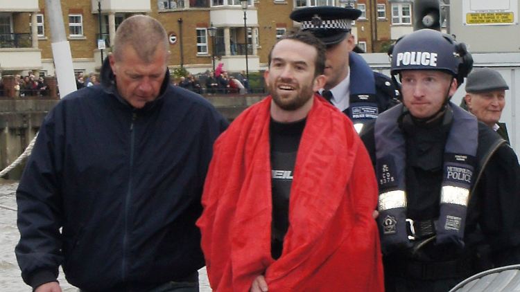 Der 35 Jahre alte Protestler in seinem Neopren-Anzug wurde von einem Motorboot gerettet und an Land von der Polizei in Handschellen abgeführt - er grinste dabei. Wegen Verstoßes gegen die öffentliche Ordnung wurde der Londoner angeklagt und muss sich am 23. April vor Gericht für seine Aktion verantworten. "Natürlich habe ich erwartet, dass die rachsüchtige Klasse rachsüchtig und garstig reagiert, weil ich ihren Spaß und ihre "Monate des Trainings" gestört habe", twitterte er.