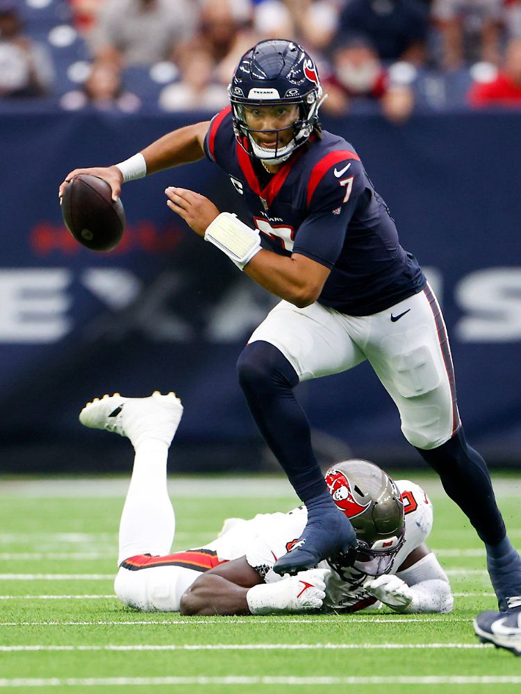 Dieser Coleridge Bernard "C. J." Stroud IV ist zwar erst seit knapp zweieinhalb Monaten in der Liga, doch Stroud hat bereits erste, deutliche Spuren hinterlassen. Seine 192 Pass-Versuche ohne Interception zu Saisonbeginn beispielsweise sind ebenso ein NFL-Rookie-Rekord, wie die erwähnten 470 Passing-Yards und fünf Touchdowns am 5. November beim 39:37-Sieg gegen die Tampa Bay Buccaneers. "Machst du Witze, C.J. Stroud?", fragte anschließend "NBC Sports".