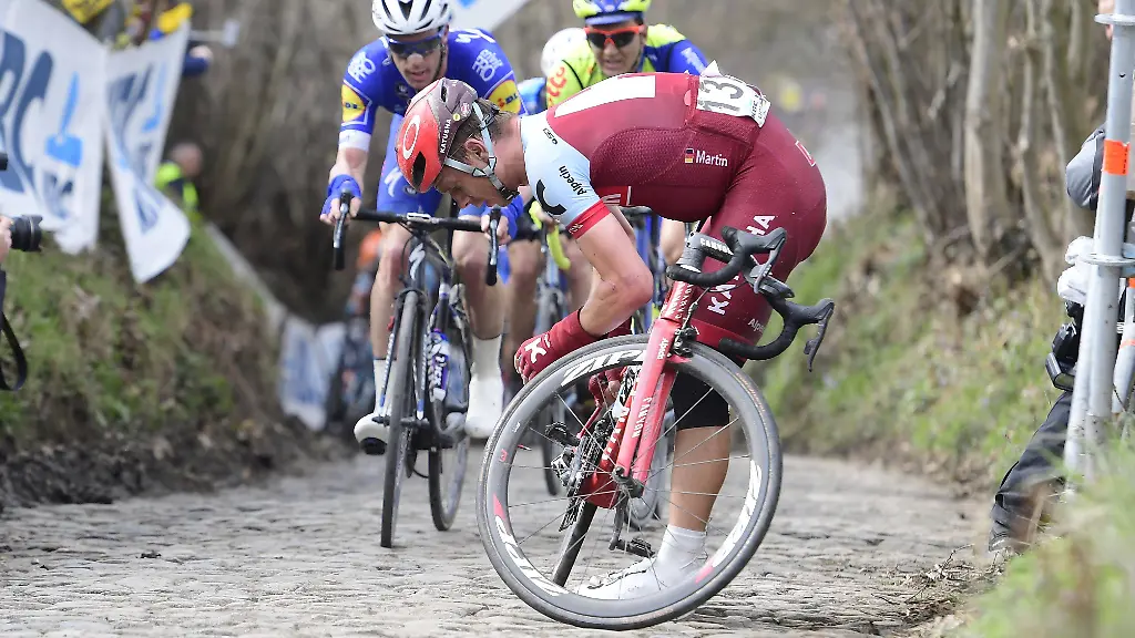 Zeitfahr-Spezialist Martin ist mit seiner körperlichen Verfassung zufrieden und zuversichtlich, ohnehin hat der 32-Jährige sein Frühjahr auf die Königin der Klassiker am 8. April ausgerichtet. "Unabhängig vom unglücklichen Ergebnis waren die Beine ziemlich gut, es war ein guter Test für Roubaix", sagte Martin, der bei der "Ronde" von den unvermeidlichen Tücken des größten Radrennens in Belgien gestoppt wurde. Am Nadelöhr Koppenberg, auf den ein schmaler und bis zu 22 Prozent steiler Kopfsteinpflasterweg führt, musste der Profi aus dem Team Katusha-Alpecin anhalten. Die Fahrer vor ihm blockierten die Straße. "Es war so steil und nass, dass ich erstmal eine Minute hochlaufen musste", berichtete Martin. An der Spitze ging derweil die Post ab, das Rennen war für ihn gelaufen. Der viermalige Zeitfahr-Weltmeister rollte als 63. mit über acht Minuten Rückstand ins Ziel.