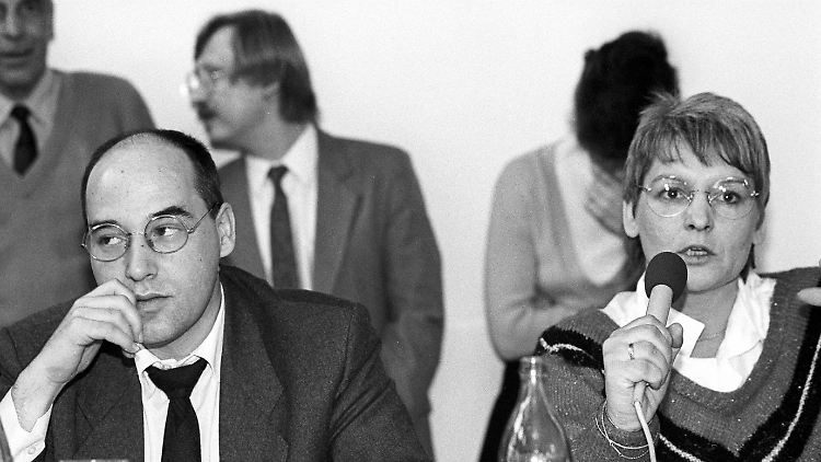 Ruth Fuchs neben Gregor Gysi bei einer Wahlkampfveranstaltung im März 1990.