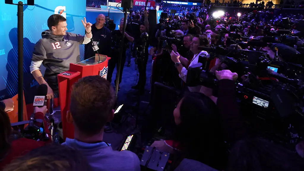 Eine Stunde bekamen die Rams die große Bühne, nach einer Stunde Unterbrechung waren dann die Patriots an der Reihe. Es war ein irres Spektakel, bei dem sich die wichtigsten Spieler sowie die Trainer hinter Pulten niederließen, die von Hunderten Journalisten belagert wurden. In der vagen Hoffnung, irgendwie ein paar Sprachfetzen aufgreifen zu können. Wobei selbst das bei den beiden Trainern und den Quaterbacks unmöglich war. Dutzende Kameras verhinderten jegliche Kontaktaufnahme bei einer Showveranstaltung mit bemerkenswert geringem journalistischen Mehrwert.