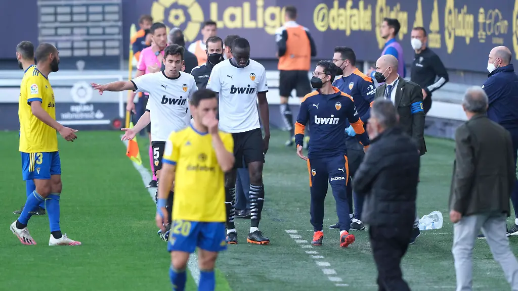 Nach dem Vorwurf einer rassistischen Äußerung war die Partie am Sonntagabend für längere Zeit unterbrochen. Die Spieler Valencias verließen nach einer knappen halben Stunde den Rasen. Zuvor hatte es auf dem Platz eine Auseinandersetzung zwischen Valencias Mouctar Diakhaby und Gegenspieler Juan Cala gegeben. Der Franzose Diakhaby war dem Augenschein nach sehr aufgebracht, er stürmte auf den Cadiz-Profi zu. Diakhaby sah die Gelbe Karte.