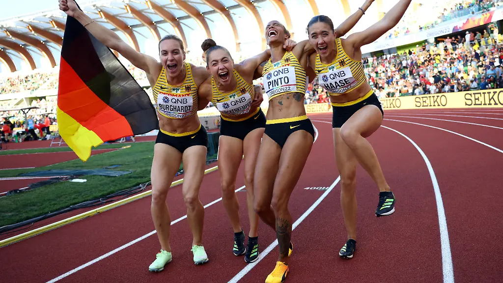Eigentlich war die deutsche Medaillenchance für den fixen Vierer nicht die allergrößte gewesen. Auch wenn Auftaktläuferin Pinto nach dem Rennen meinte: "Als ich am Start stand, war das für mich klar. Wir waren mental auf diese Bronzemedaille vorbereitet." Dass die USA und Topfavorit Jamaika den Sieg unter sich ausmachen würden, schien in Stein gemeißelt. Dahinter war aber Großbritannien um Ex-Weltmeisterin Dinah Asher-Smith der erste Bronzekandidat - doch Asher-Smith verletzte sich an Position drei, die Britinnen kamen nur als Sechste ins Ziel. Die Tür war offen für die Deutschen - und sie stürmten hindurch.
