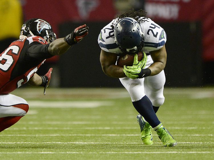 Erstaunlich ist jedoch, dass die NFL derzeit Collagen von Lynchs zupackendem Griff für 149,95 Dollar verkauft. Es ist dieses zwielichtige Verhalten der Liga, das dem Profi missfällt - auch wenn er es aus Angst vor einer Strafe nie öffentlich sagen würde. "Wenn Marshawn mit den Medien sprechen soll, wäre es so, als wenn die Medien Football spielen und Adrian Peterson tacklen müssten", sagt Seattles Cornerback Richard Sherman.
