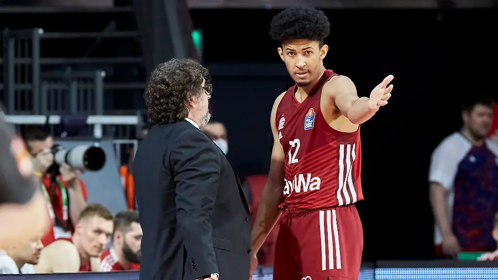 Jason George und der damalige Trainer des FC Bayern, Andrea Trinchieri, im Jahr 2022. (Foto: IMAGO/Eibner)