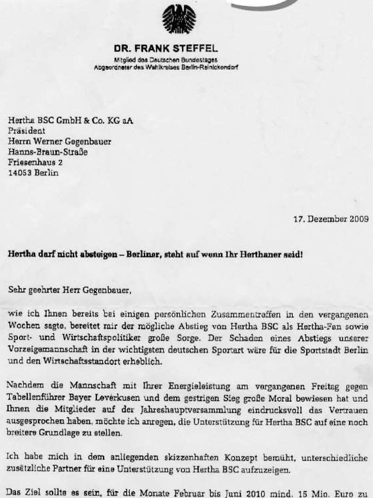 "Das Ziel sollte sein, für die Monate Februar bis Juni 2010 mindestens 15 Millionen Euro zu akquirieren und dadurch weitere hochkarätige Verstärkungen zu verpflichten", heißt es in dem Schreiben vom 17. Dezember 2009. Man dürfe nicht zulassen, dass Hertha "fast unbemerkt absteigt und wir nicht versucht haben, die Berliner für einen Verbleib in der 1. Bundesliga zu motivieren und zu mobilisieren." In seinem Planungseifer scheint Steffel allerdings übersehen zu haben, dass das Transferfenster bereits Ende Januar schließt und die erhofften Millioneneinnahmen deshalb nicht wie vorgeschlagen in Neuzugänge investiert werden könnten.