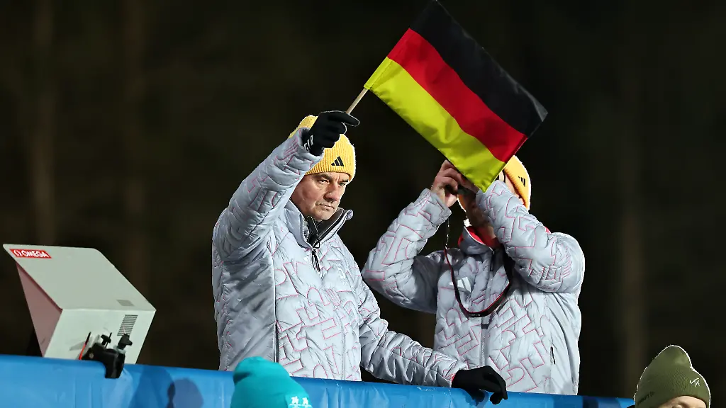 Olympia-Olympische-Winterspiele-Mailand-Cortina-2026-Ski-nordisch-Skispringen-Super-Team-Maenner-Probedurchgang-Stefan-Horngacher-l-Bundestrainer-der-deutschen-Skisprungmannschaft-winkt-auf-dem-Trainerturm-eine-Springer-ab
