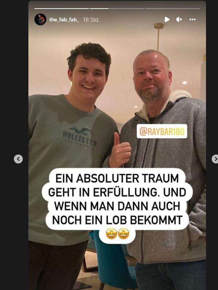 - "Ein absoluter Traum geht in Erfüllung. Und wenn man dann auch noch ein Lob bekommt", schrieb der 16-jährige Schmutzler bei Instagram zu einem Bild der beiden Darts-Spieler.