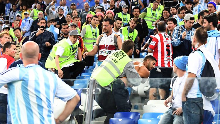 Nachdem russische Hooligans 2016 in Frankreich für grausige Szenen sorgten, machen in Russland nun andere "Fans" Schlagzeilen: Die argentinische Regierung fordert vom WM-Gastgeber die Abschiebung mehrerer Argentinier, die bei der 0:3-Niederlage gegen Kroatien einen kroatischen Fan verprügelt haben. Das berichteten russische Medien. Die argentinische Sicherheitsministerin Patricia Bullrich veröffentlichte bei Twitter die Fotos von vier Argentiniern, die bei dem Zwischenfall am Mittwoch im Stadion von Nischni Nowgorod identifiziert worden waren.